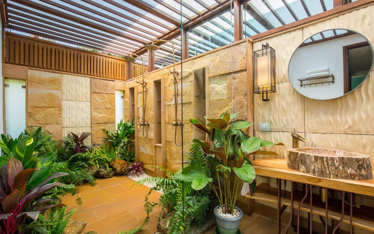 The bathrooms are all spacious and finished to a high standard with glass, high dimensional wood slabs of acacia and natural stones. Two of them have inside/outside showers set in small, private, tropical gardens and another has a large folding window.