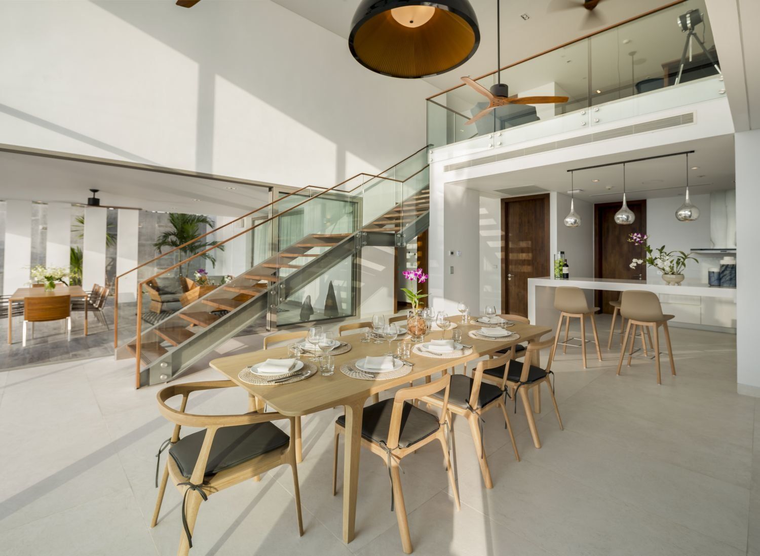 The duplex residences occupy the ground and first floors of the exclusive three-storey apartment buildings, with the penthouse residences on the third floor. In each duplex, a private lift and central staircase connect three bedrooms on the upper floor to the open-plan living, dining and kitchen area, pool terrace and fourth bedroom on the ground floor. Two master suites are set at the front of the top floor for optimal views, with a guest bedroom tucked behind.